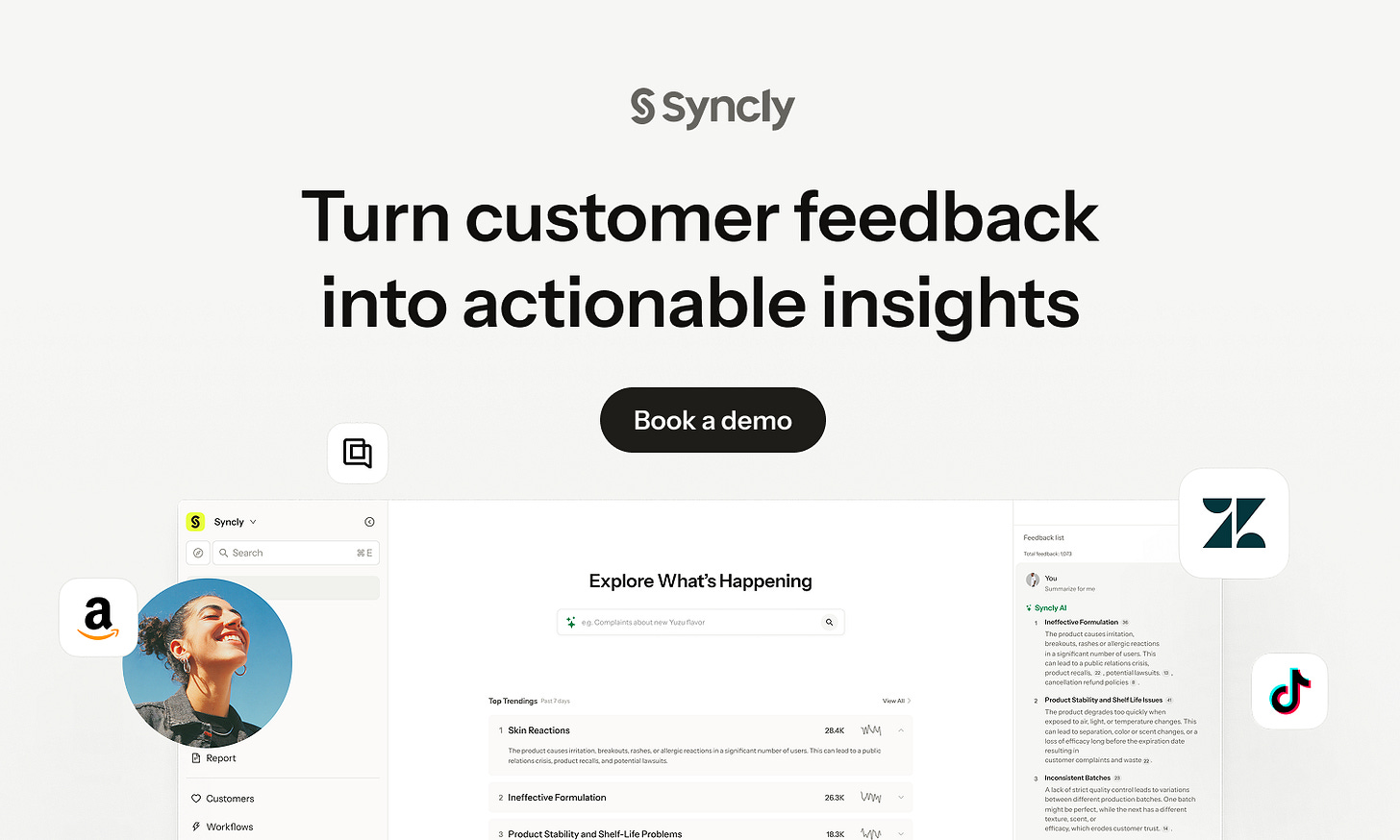 Syncly aggregates customer feedback from multiple sources, including support tickets, product reviews, and social comments, to provide actionable insights that help brands grow faster.