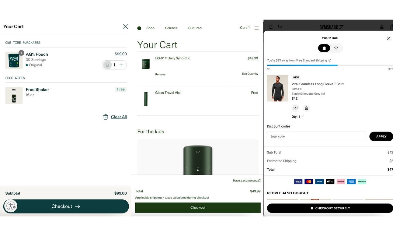 Gymshark did over £600 million in 2024. Their cart is almost boring. No popups. No bundles. No urgency banners. Just a clean page that stays out of the way. Take a peek at AG1 and seed as well.